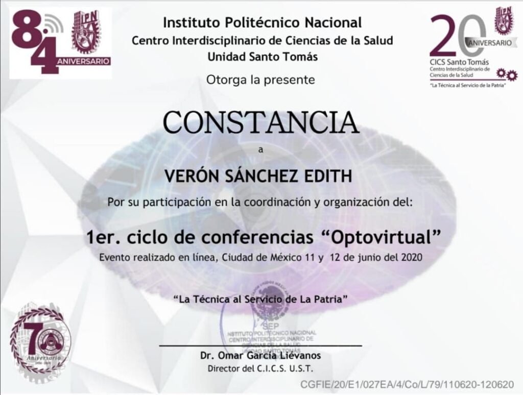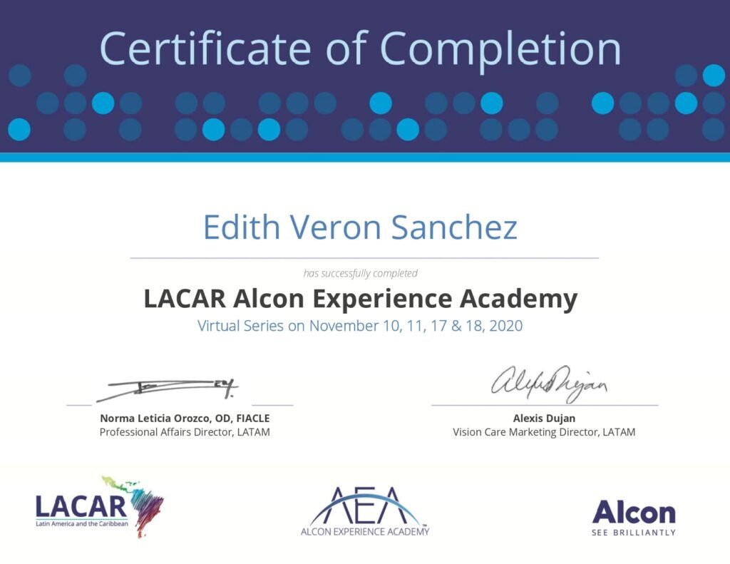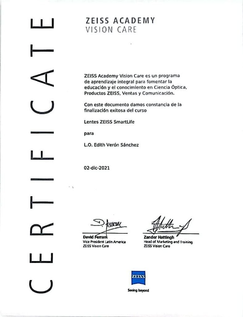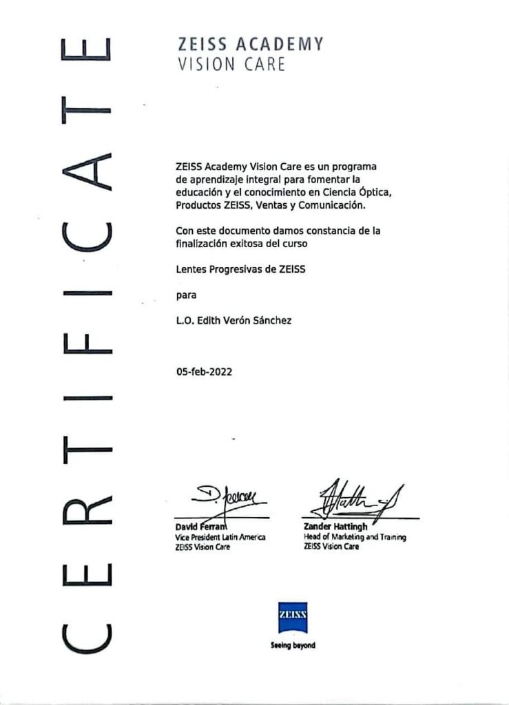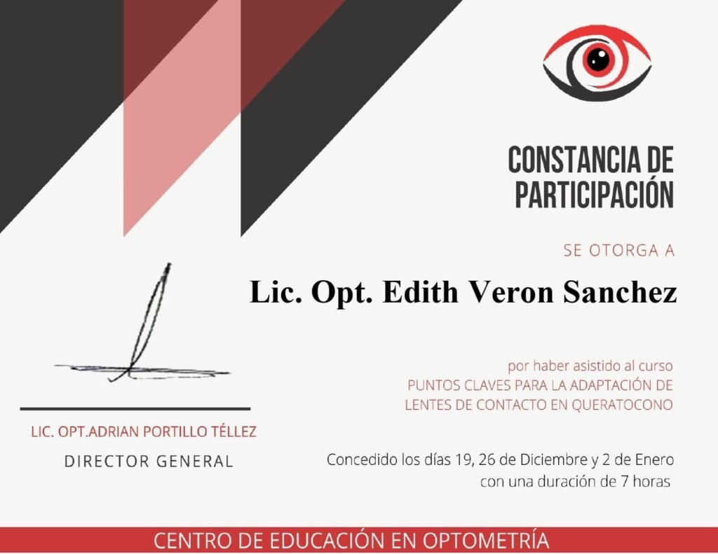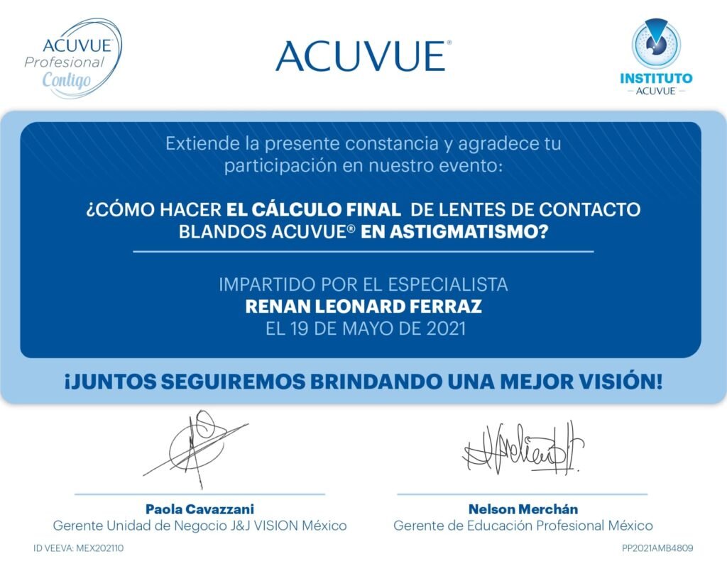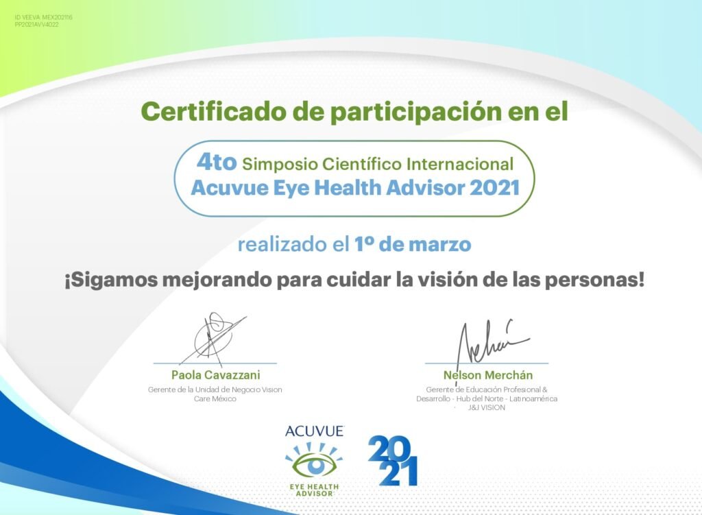 Para mí, la confianza se construye con preparación y constancia. Es por eso que me mantengo en actualización constante: cuento con constancias y certificaciones en temas clave como adaptación de lentes de contacto (incluyendo astigmatismo y queratocono), lentes progresivos, salud visual y evaluación clínica. También he participado en simposios y academias internacionales del sector (por ejemplo, ACUVUE/J&J Vision, Alcon y ZEISS Academy), además de actividades académicas y de investigación relacionadas con miopía y fatiga visual.