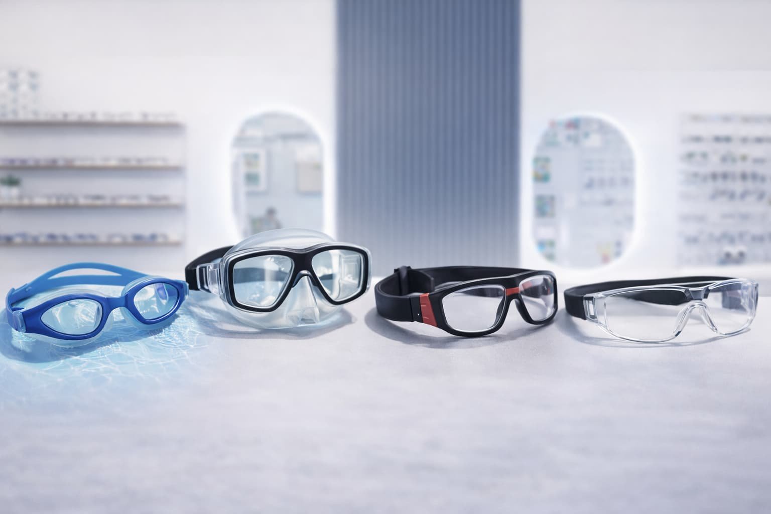 Opciones de goggles/visores graduados según tu actividad: natación, buceo, deporte de alto impacto o lentes de seguridad con graduación.