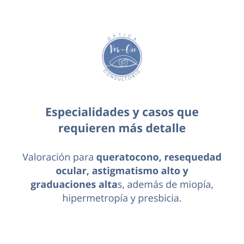 Valoración para casos que requieren mayor precisión. Revisamos opciones de lentes de contacto para queratocono cuando aplica.